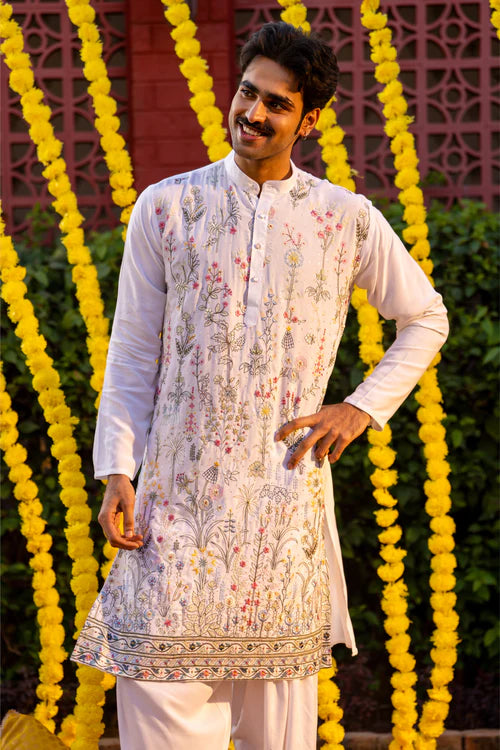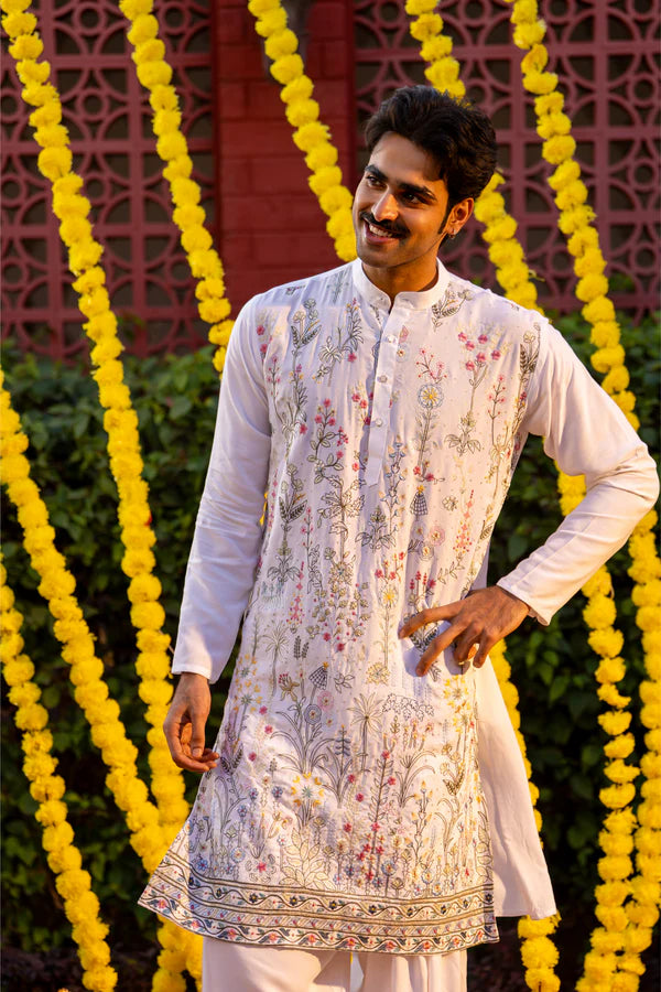 Royal White Floral Embroidery Men’s Festive Kurta - Ethnic