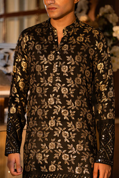 Traditional Black Men's Kurta with Rich Gold Embroidery